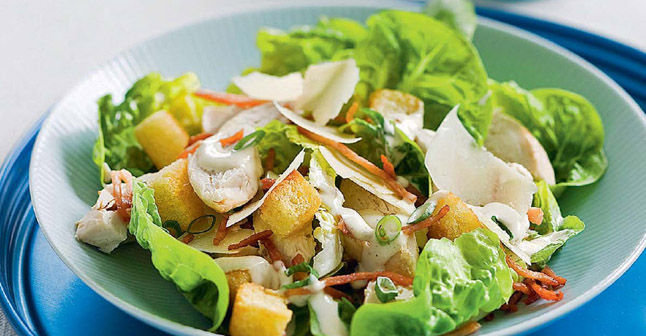 Faites dorer le pain, coupé en cubes, 3 min dans un peu d'huile. Déchirez les feuilles de romaine dans un saladier, et ajoutez lescroûtons préalablement épongés dans du papier absorbant. Préparez la sauce : Faites cuire l'oeuf 1 min 30 dans l'eau bouillante, et rafraîchissez-le. Cassez-le dans le bol d'un mixeur et mixez, avec tous les autres ingrédients; rectifiez l'assaissonnement et incorporez à la salade. Décorez de copeaux de parmesan, et servez